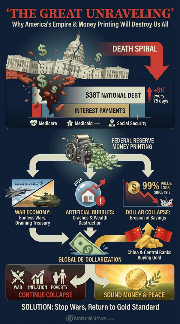 The United States is a murder suicide empire disguised as a democracy. We are using our own people as cannon fodder in endless wars and as tax fodder to fund a global military machine that enriches a few at the expense of the many. The national debt has crossed $38 trillion and is now increasing by $1 trillion roughly every 75 days, as I reported in my Health Ranger Report last year [1]. Interest payments on that debt now exceed the entire budgets for Medicare and Medicaid. Only Social Security is larger.
